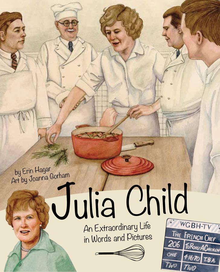 Erin: This book started with the idea for its structure. The publisher had the great idea to adapt the visual format of Brian Selznick’s amazing The Invention of Hugo Cabret (Scholastic, 2007) to a biography, depicting major moments in the subject’s life in visual sequences. It’s an amazing concept. We brainstormed possible subjects, and I suggested Gordon Ramsay because my family loves Master Chef, Jr. After discussing it a bit, we thought, “Why not the television cook who started it all?” Voilà–Julia it was!